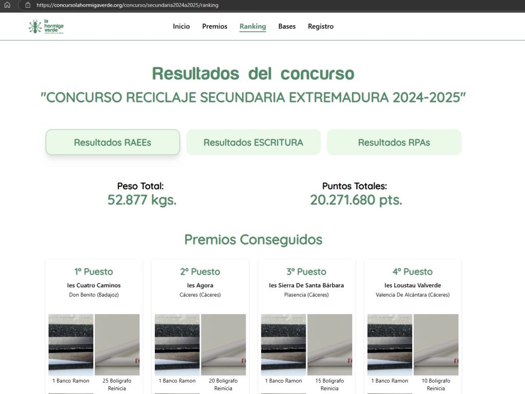 RESULTADOS DEL CONCURSO DE RECICLAJE EN CENTROS ESCOLARES DE EXTREMADURA